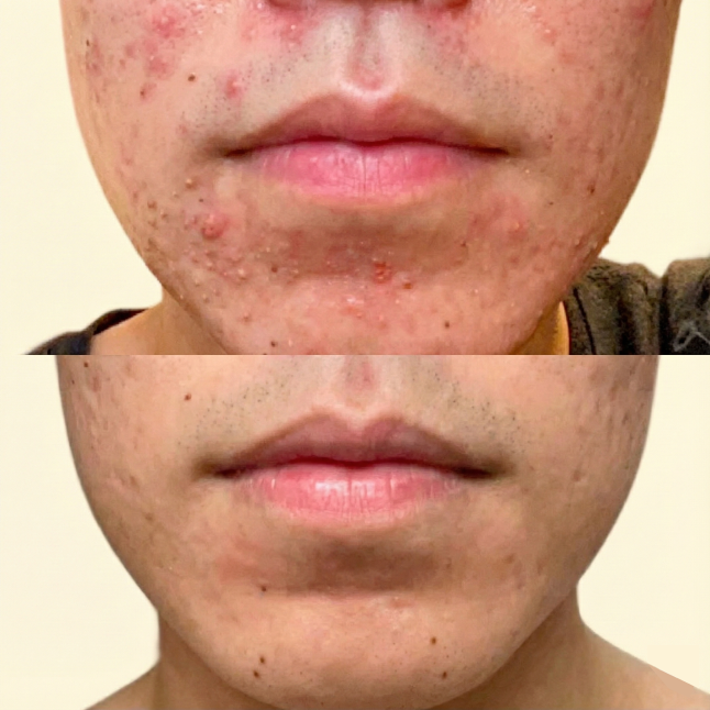 治療開始時は額を中心に大きな赤ニキビが多く見られたため、まずはエピデュオゲルを含む外用薬セットで炎症を抑える治療を行いました。開始から約1ヶ月で新しいニキビができにくくなり、改善を実感されたとのことです。その後も毎日欠かさずお薬を継続していただき、生活面でも脂っこい食事や小麦を控えるなど工夫されていました。