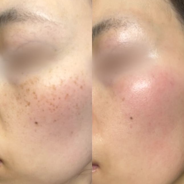 頬骨の上にモヤモヤと広がる色斑に悩んでいらっしゃいました。日光性のシミや肝斑が混在している状況だったので、飲み薬と塗り薬を継続的に使用することでしっかりとシミを排出し、均一な肌色へ近づけることができました。