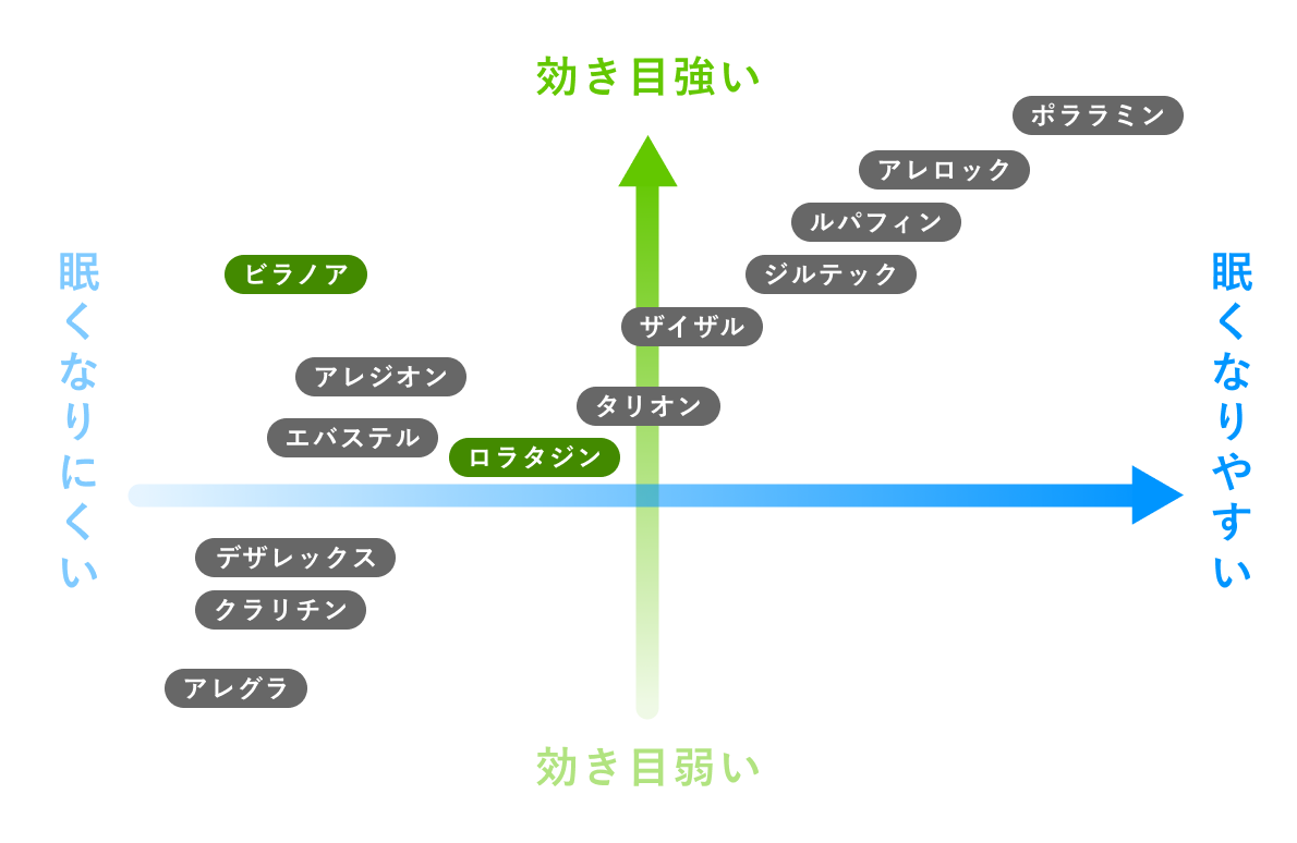 第2世代の中でも、ビラノア、アレグラ、デザレックス、ロラタジンは、車の運転が可能なほど眠気が少ない薬です。