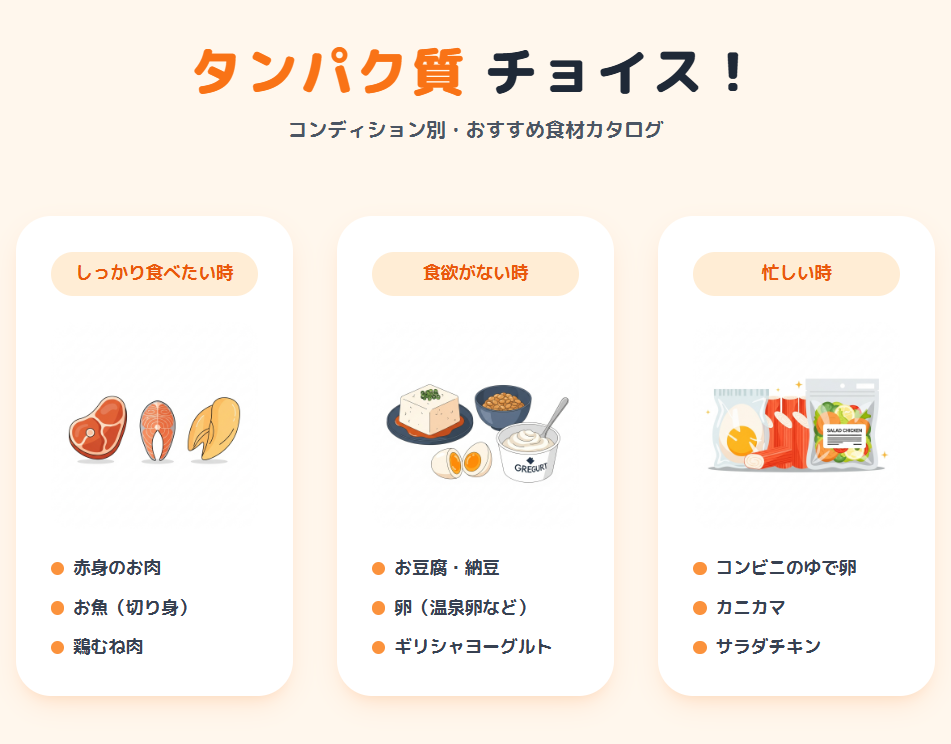 食欲がない日は無理をせず、でも「これなら食べられそう」というタンパク質を一つだけ選んでみてください。あなたらしい理想のスタイルを支える、心強い習慣になります。この調子で、一歩ずつ進んでいきましょう。