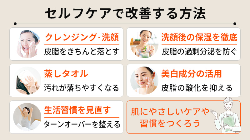 日々のスキンケアでは、やさしいクレンジングと保湿を基本に、蒸しタオルで毛穴を開かせて汚れを落とす、収れん化粧水で引き締めるなど、肌状態に合わせた工夫が効果的です。