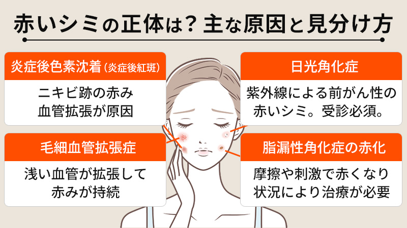 赤いシミのように見える肌トラブルには、いくつかのタイプがあります。なかには皮膚科での早期対応が必要なものもあるため、まずはその“正体”を知ることが大切です
